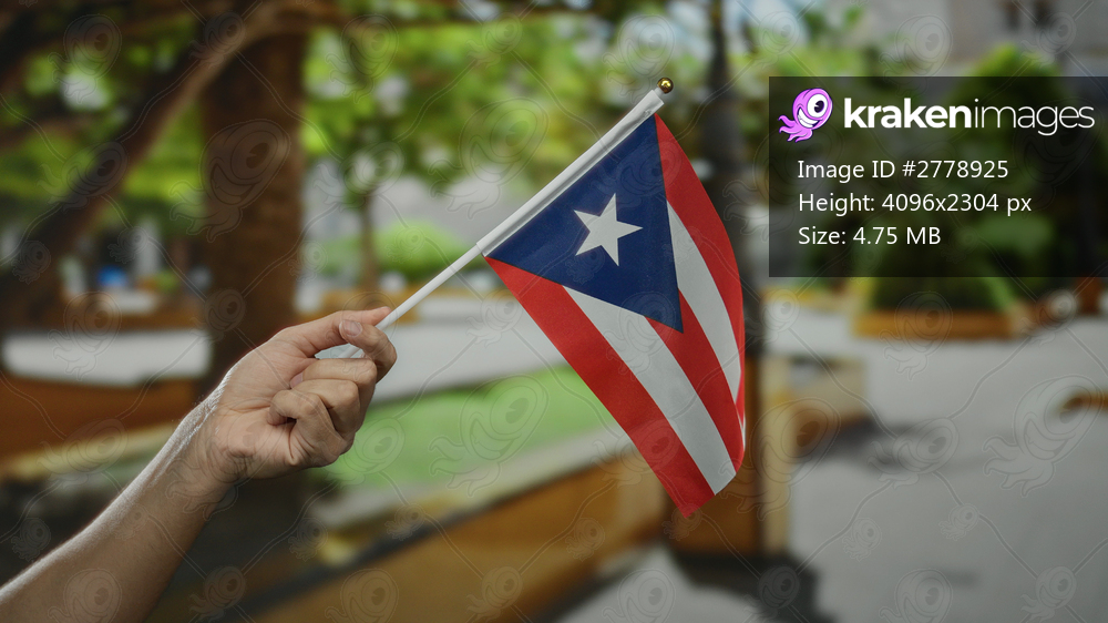 Caucasian male holding puerto rican flag in sunny outdoor park, capturing national pride and celebration under a clear blue sky.
