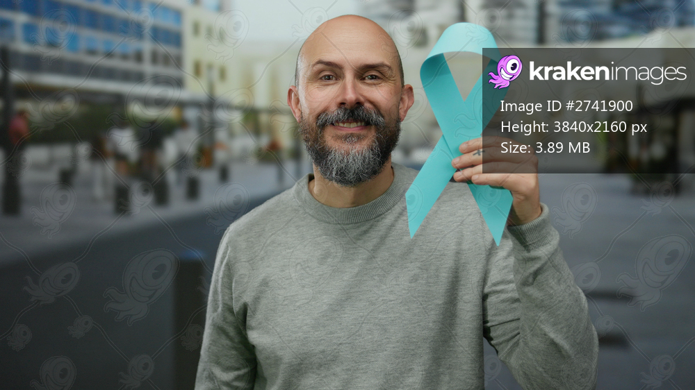 Caucasian man with bald head and beard holds blue cancer awareness ribbon on urban street background highlighting health and awareness themes.