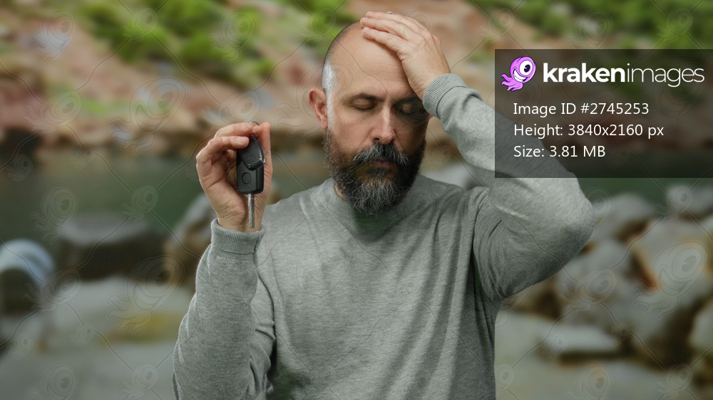 Caucasian man with beard and bald head stands at seaside, wearing sweater, holding car key, looking concerned amidst nature backdrop.
