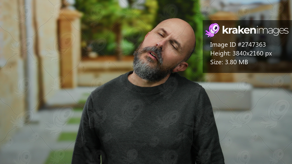 Caucasian man with beard feeling neck pain on an urban street in a city setting, expressing discomfort outdoors.