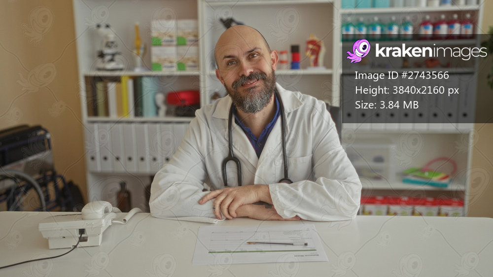 Caucasian man with beard sitting at desk in clinic office smiling confidently wearing white coat with stethoscope surrounded by medical equipment and paperwork showcasing healthcare setting - Kraken Images