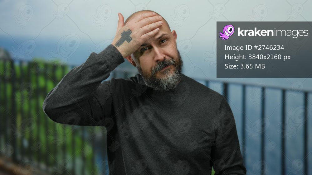Caucasian man with beard stands outdoors on a seaside promenade, appearing thoughtful beneath the warm sun.