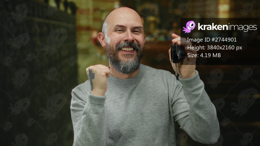 Caucasian man celebrating while holding car keys indoors at a church, expressing happiness and triumph with a joyful expression.