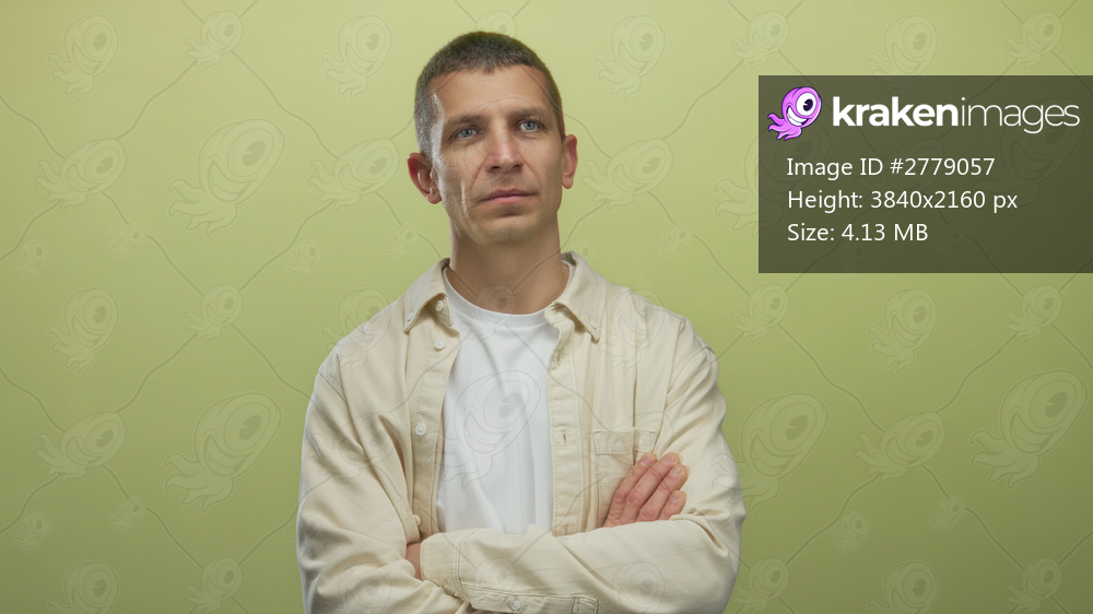 Caucasian man crossing arms in front of yellow wall isolated background wearing casual beige shirt with closed eyes, relaxed expression, showing calm and serene demeanor. - Kraken Images