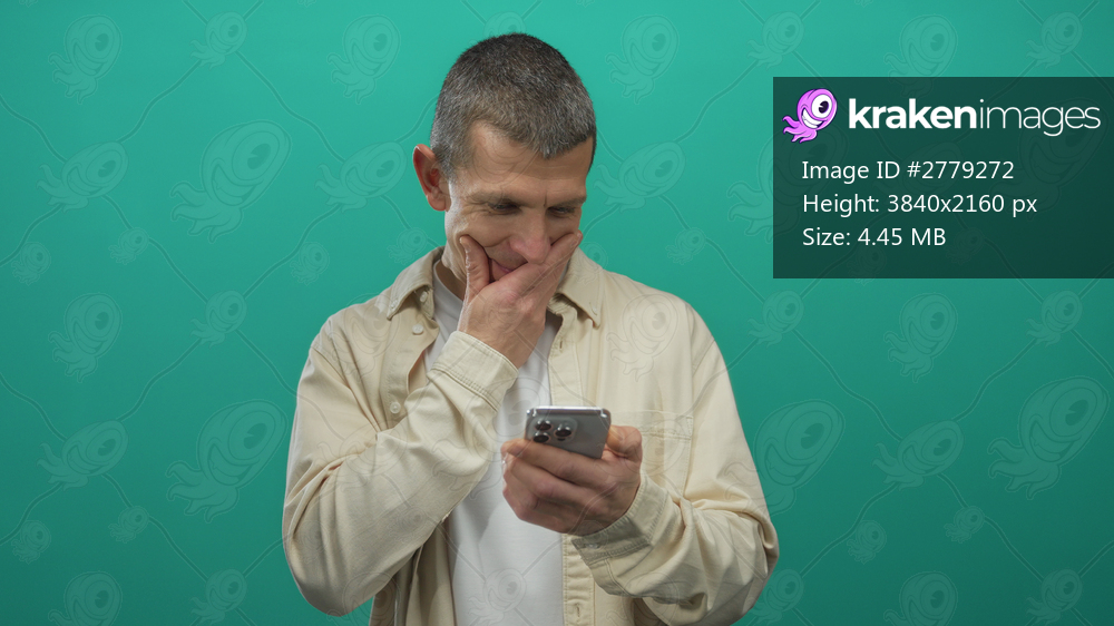 Caucasian man engaging with smartphone against isolated green background wall, highlighting expressions and gestures suggesting various emotions and interactions. - Kraken Images