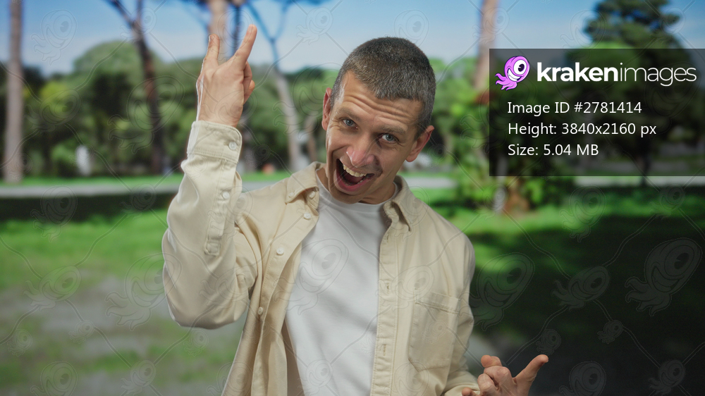 Caucasian man enthusiastically gestures rock hands in a sunny park, smiling amid lush green outdoor setting under clear blue sky.