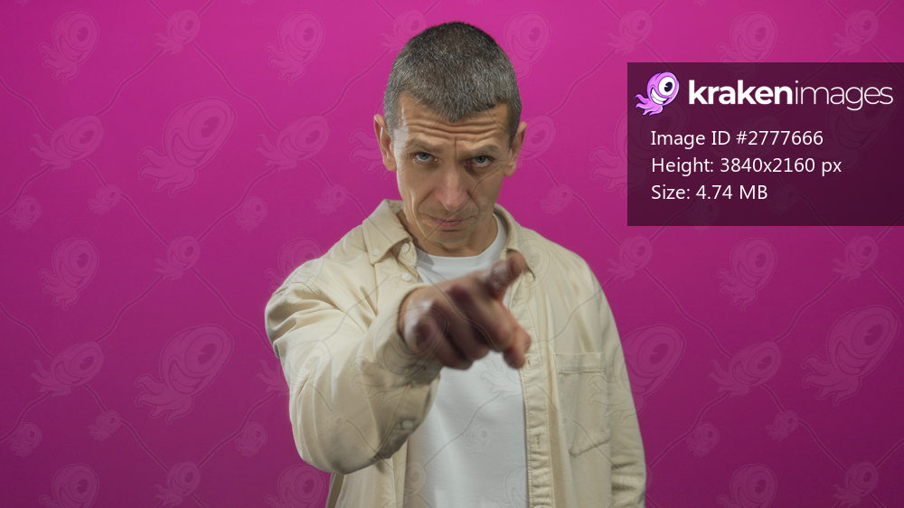 Caucasian man gestures with his hand indicating someone to leave, standing against a vibrant pink background, wearing a light shirt and looking directly at the camera. - Kraken Images
