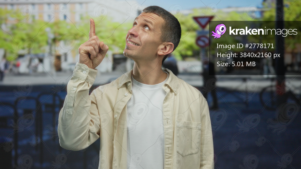 Caucasian man gesturing outdoors in a lively street setting points his finger up against a blurred city background with clear skies and vibrant urban ambiance. - Kraken Images