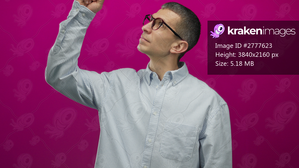 Caucasian man with glasses making a thumb down gesture against a vibrant pink isolated wall wearing a striped shirt, expressing disapproval and seriousness. - Kraken Images