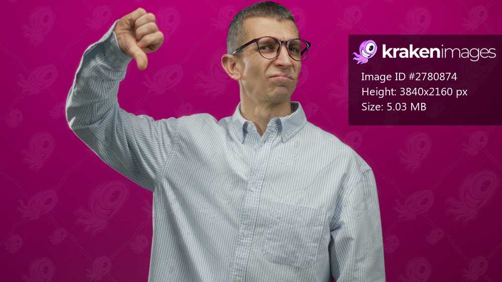 Caucasian man with glasses making a thumb down gesture against a vibrant pink isolated wall wearing a striped shirt, expressing disapproval and seriousness. - Kraken Images