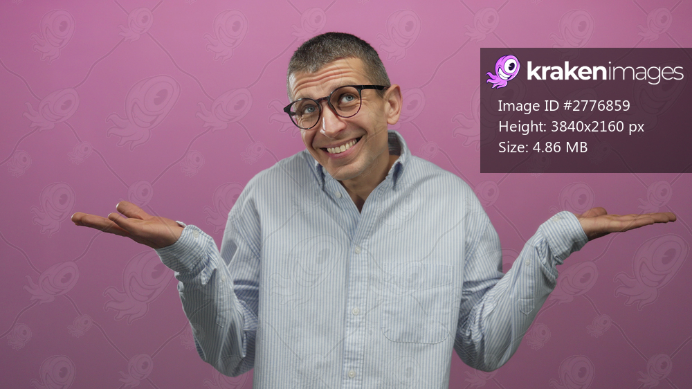 Caucasian man with glasses wearing striped shirt stands against pink background expressing confusion with a shrug, isolated and informal setting.