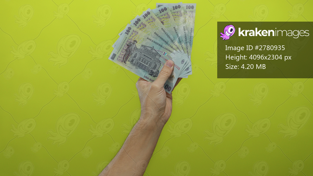 Caucasian man hand holding romanian banknotes isolated against bright yellow background, emphasizing finance and economic concepts through a vibrant setting. - Kraken Images