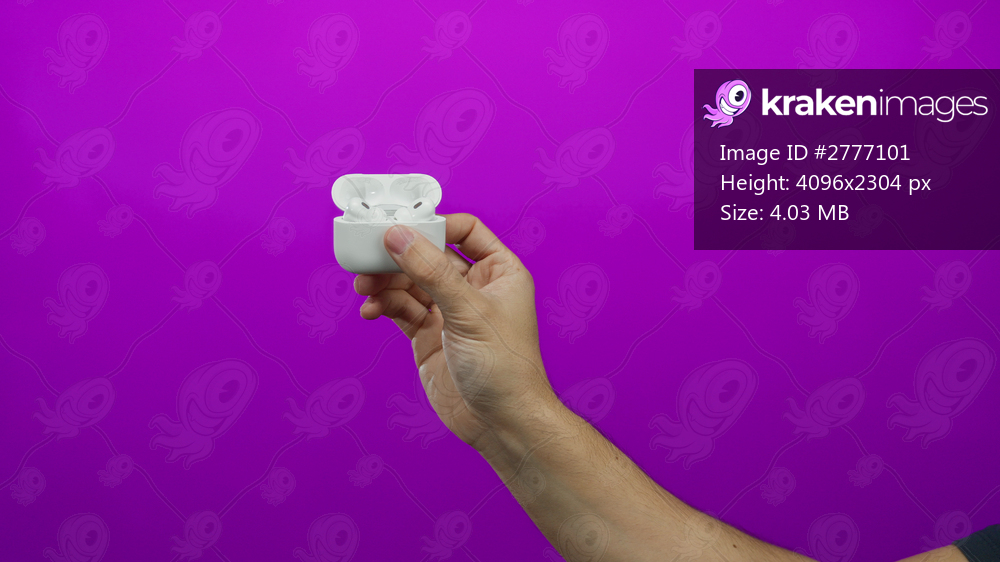 Caucasian man hand holding wireless earbuds case against vibrant pink background, showcasing modern technology and isolated presentation.