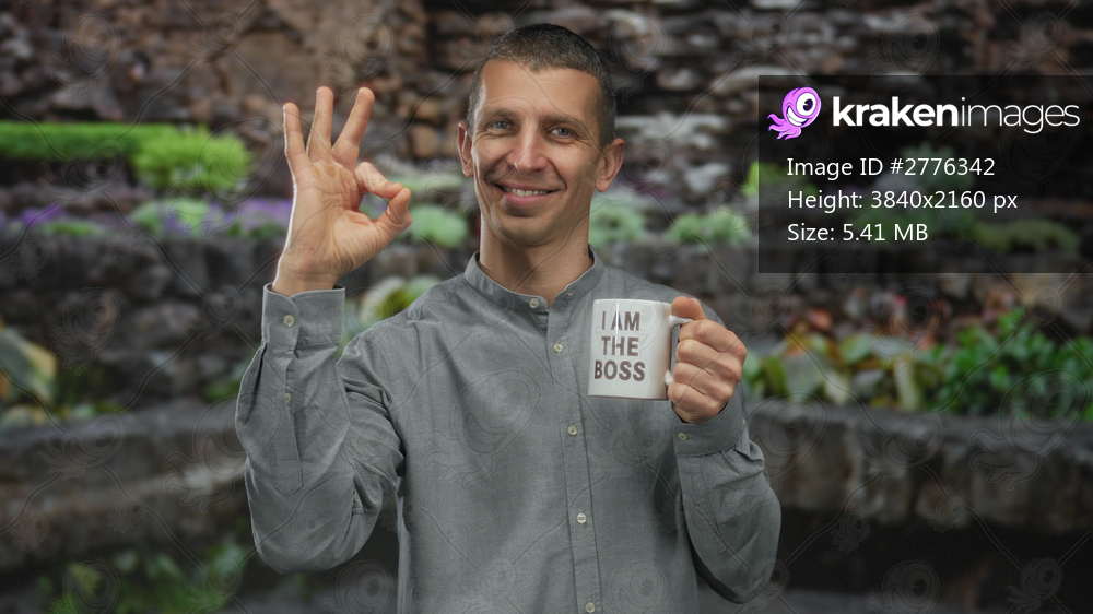 Caucasian man holding a coffee cup with a playful smile makes an okay gesture in a lush outdoor park setting.