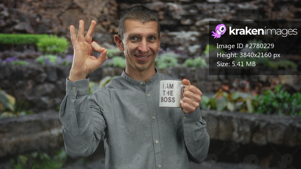 Caucasian man holding a coffee cup with a playful smile makes an okay gesture in a lush outdoor park setting.