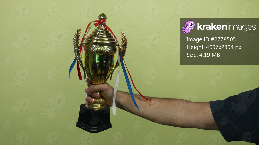 Caucasian man holding a golden trophy with ribbons against a yellow wall, symbolizing victory and celebration.