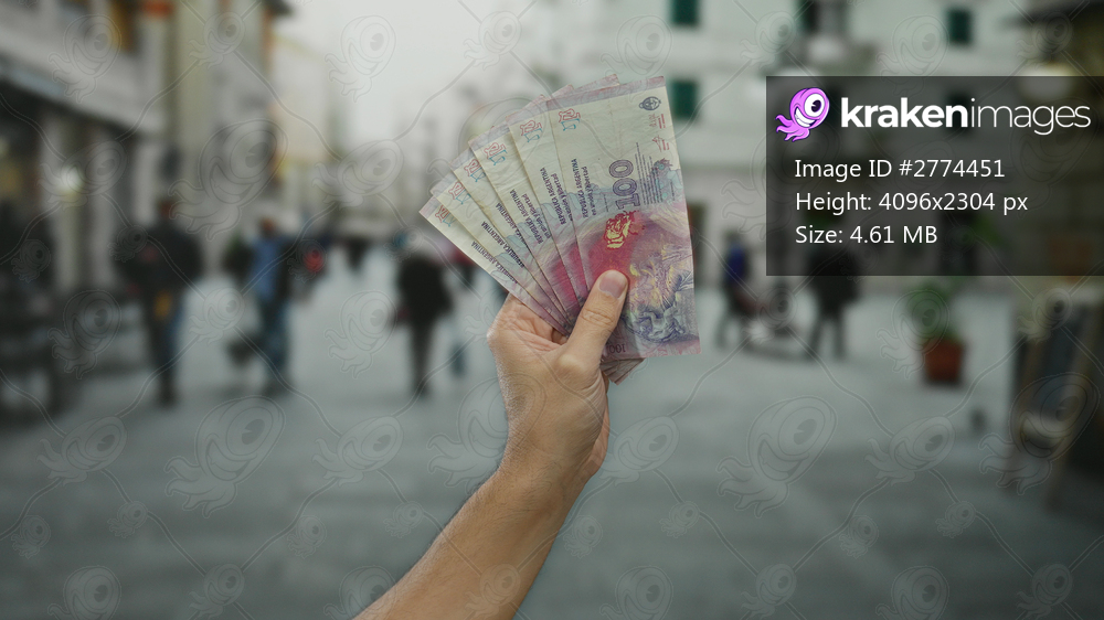 Caucasian man holding argentine pesos in hand on a bustling city street showcasing economic concept outdoors with urban life backdrop.