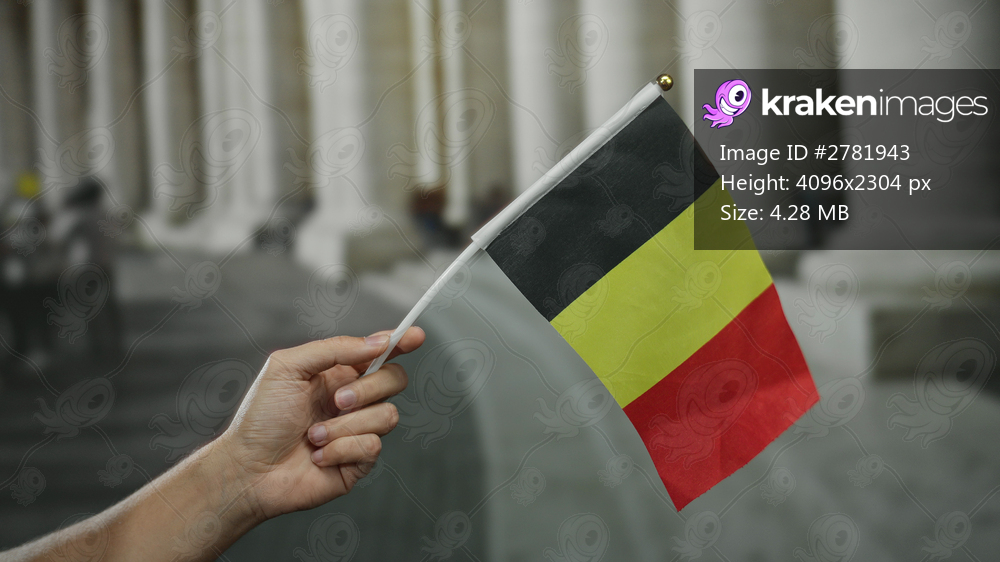 Caucasian man holding belgian flag inside old university building with large pillars in belgium showcasing national pride and academic environment.