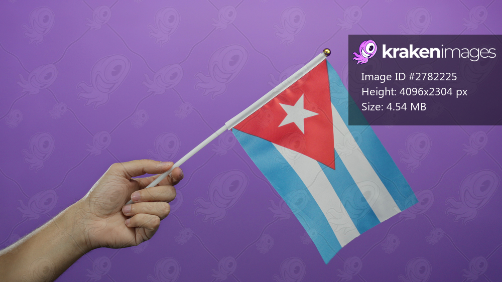 Caucasian man holding cuban flag against a vibrant purple wall, capturing a cultural expression in an isolated setting.