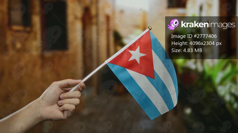 Caucasian man holding cuban flag on city street captures national pride in colorful urban setting.