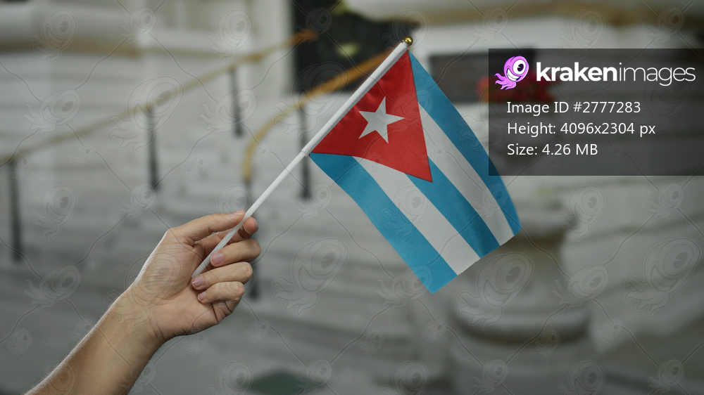 Caucasian man holding cuban flag outdoors in city street with focus on hand against blurred urban background showcasing national pride and identity.