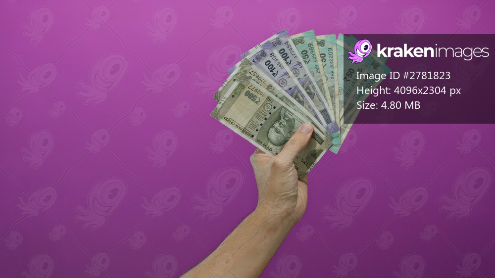 Caucasian man holding indian rupee banknotes in hand against a vibrant pink wall, showcasing currency and financial concepts in an isolated setting.