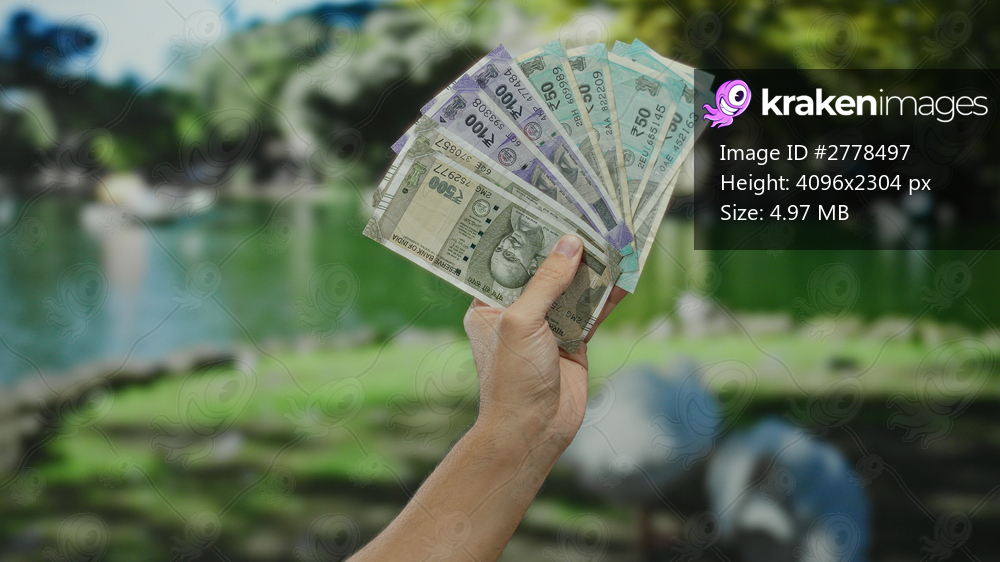 Caucasian man holding indian rupee banknotes in hand at a park demonstrating financial success in an outdoor setting with lush greenery and pond in the background. - Kraken Images