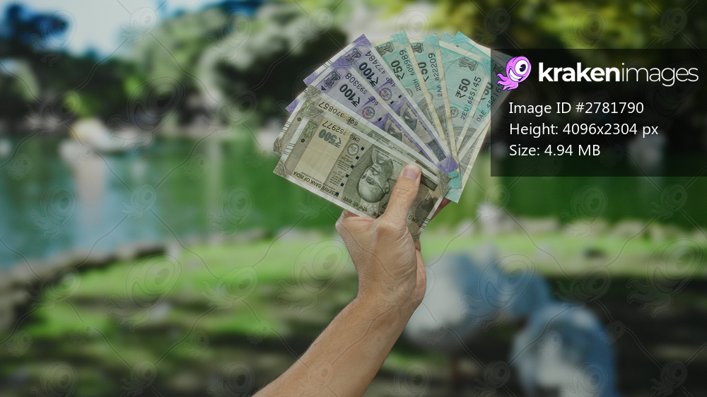 Caucasian man holding indian rupee banknotes in hand at a park demonstrating financial success in an outdoor setting with lush greenery and pond in the background. - Kraken Images