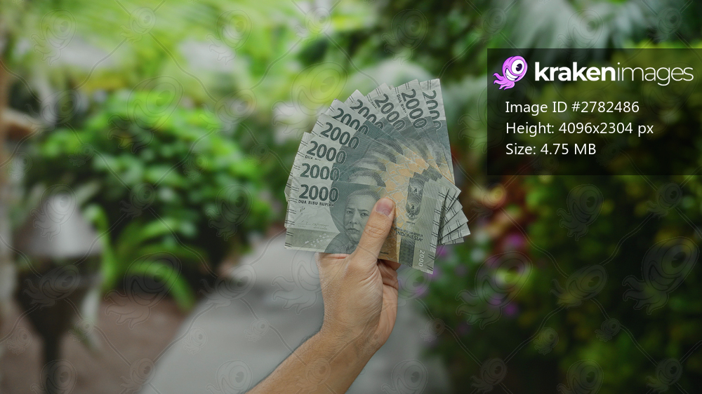 Caucasian man holding indonesian rupiah banknotes in an outdoor park setting, showcasing currency against a vibrant nature background, emphasizing finance and travel concepts. - Kraken Images
