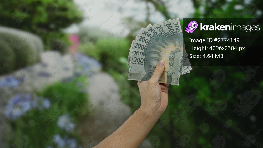 Caucasian man holding indonesian rupiah banknotes outdoors in a lush park, showcasing currency exchange and financial success against a vibrant natural backdrop. - Kraken Images