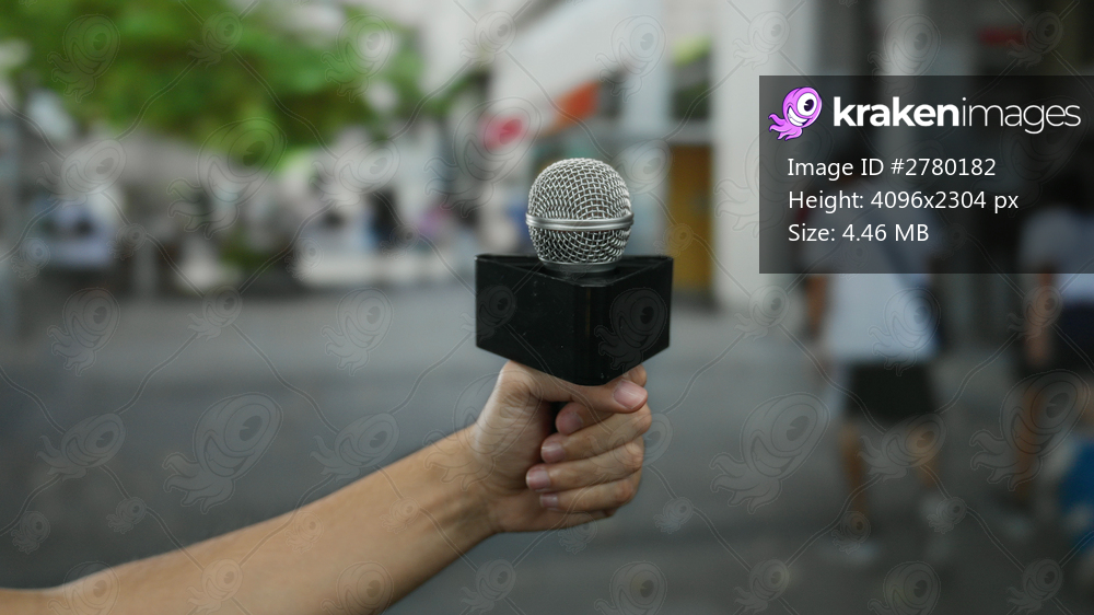 Caucasian man holding microphone on city street in outdoor urban setting, capturing media, interview, and communication in public environment.