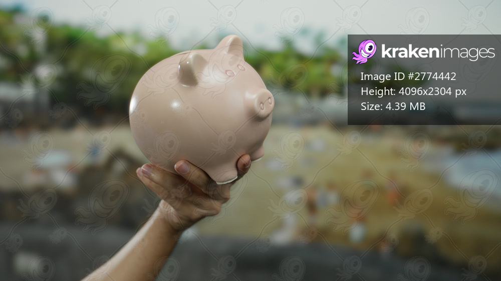 Caucasian man holding piggy bank at beach setup, symbolizing financial freedom and outdoor adventure with a seaside backdrop.
