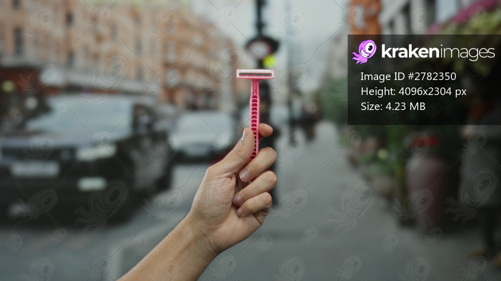 Caucasian man holding pink razor on a busy city street, highlighting self-care in an urban environment, with buildings and cars in the background.
