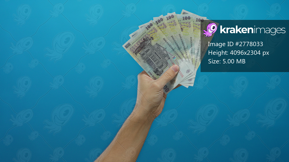 Caucasian man holding romanian banknotes fanned out against a solid blue wall backdrop emphasizing financial prosperity and currency handling with precision. - Kraken Images