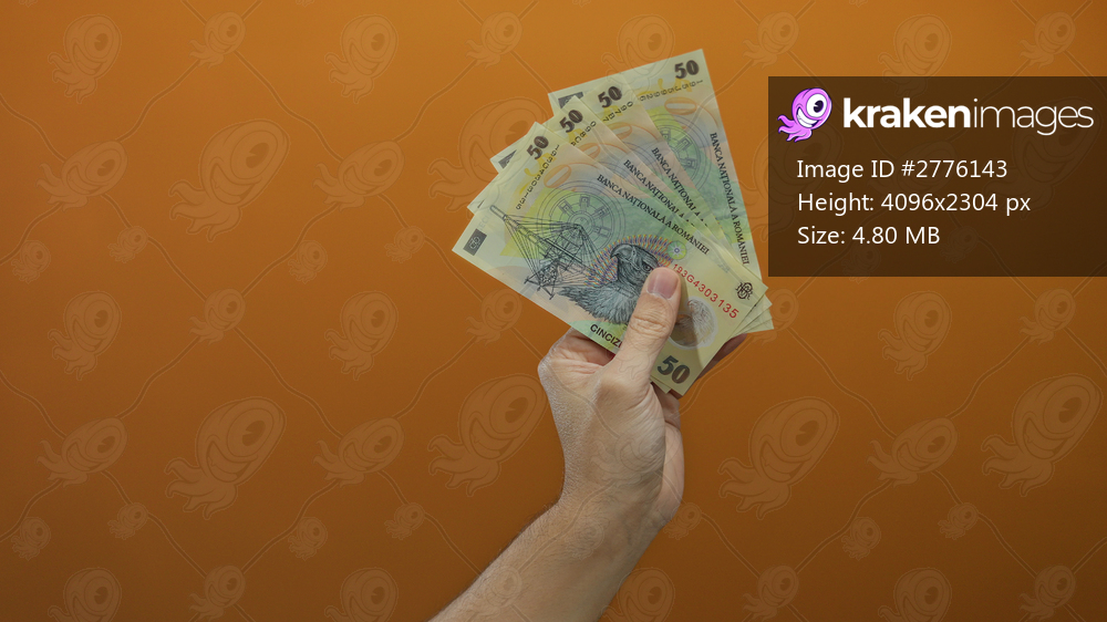 Caucasian man holding romanian lei banknotes against an isolated orange background, showcasing financial concept and currency focus in a vibrant indoor setting. - Kraken Images