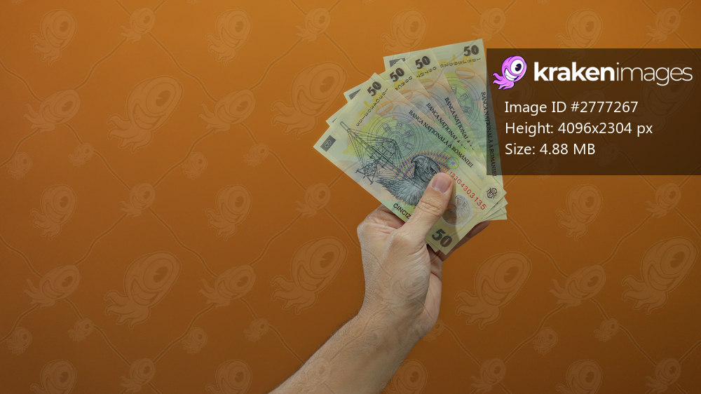 Caucasian man holding romanian lei banknotes against an isolated orange background, showcasing financial concept and currency focus in a vibrant indoor setting. - Kraken Images