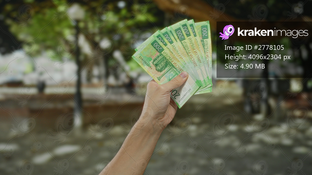 Caucasian man holding russian ruble banknotes outdoors in a city street, showcasing financial prosperity and urban life.