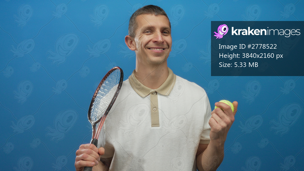 Caucasian man holding tennis racket and ball against blue background, expressing positive emotion in isolated wall setting, highlighting sport and athleticism. - Kraken Images