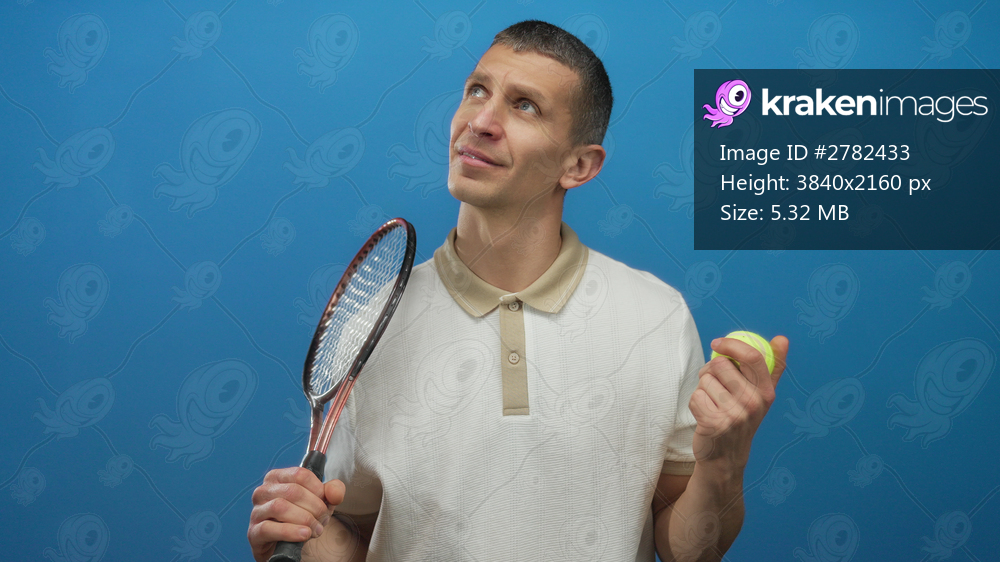 Caucasian man holding tennis racket and ball against blue background, expressing positive emotion in isolated wall setting, highlighting sport and athleticism. - Kraken Images