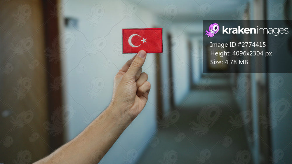 Caucasian man holding turkish flag patch in a hotel corridor illustrates cultural identity indoors.