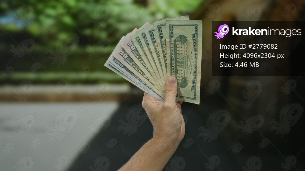 Caucasian man holding united states dollar banknotes outdoors on a city street showcasing wealth and financial success with a green blurred background. - Kraken Images