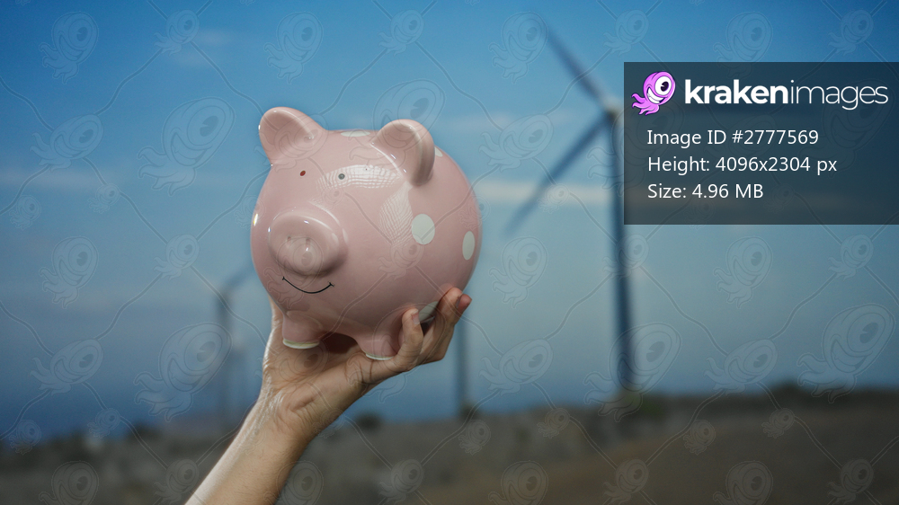 Caucasian man holds a pink piggy bank against a backdrop of windmills in an outdoor field, symbolizing savings and renewable energy, under a clear blue sky. - Kraken Images