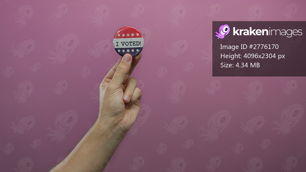 Caucasian man holds a voting badge against an isolated pink background, symbolizing civic engagement and democratic participation in an election.