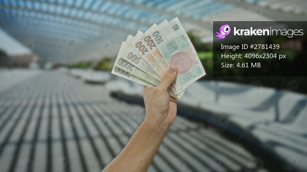 Caucasian man holds czech koruna banknotes outdoors in a city street, capturing vibrant and dynamic urban life.