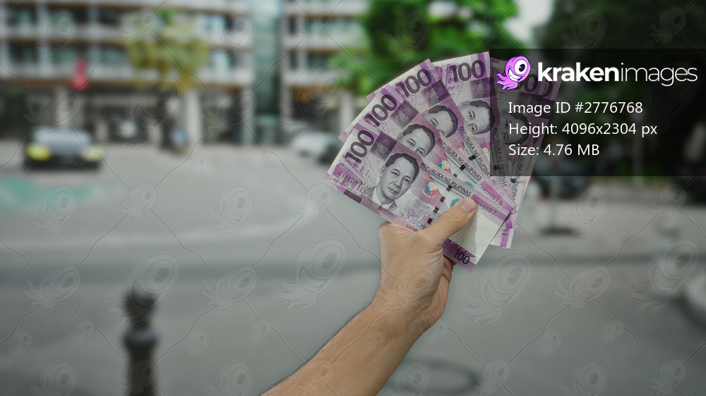 Caucasian man holds philippine pesos on a city street, showcasing currency amidst urban life, with focus on hand and banknotes in an outdoor setting.