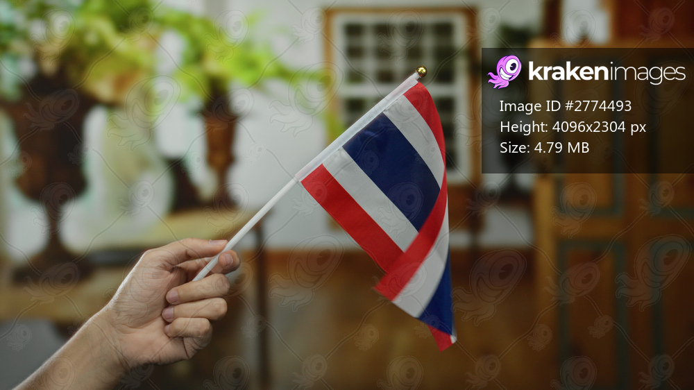 Caucasian man holds thai flag indoors in a hotel, focusing on nationalism and travel within thailand.
