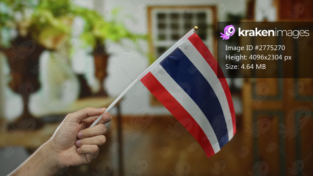 Caucasian man holds thai flag indoors in a hotel, focusing on nationalism and travel within thailand.