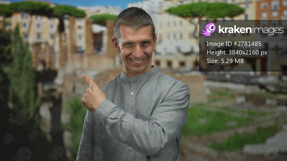 Caucasian man in a grey shirt points excitedly at roman ruins in the background under clear blue skies, exuding a sense of adventure and exploration in an outdoor setting. - Kraken Images