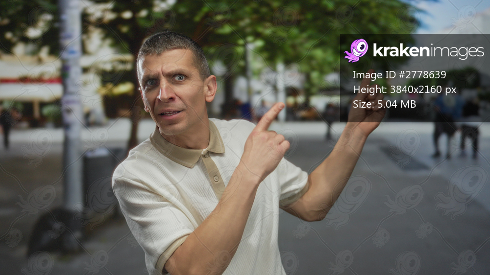 Caucasian man in a white shirt points expressively while standing on a bustling street, surrounded by people and trees, creating a dynamic scene of urban life outdoors. - Kraken Images