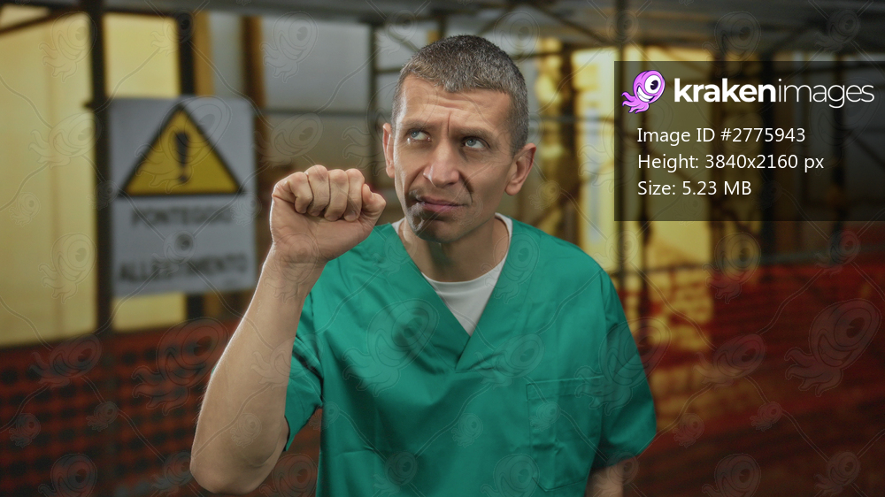 Caucasian man in doctor uniform gestures knocking at construction site warning area outdoor.